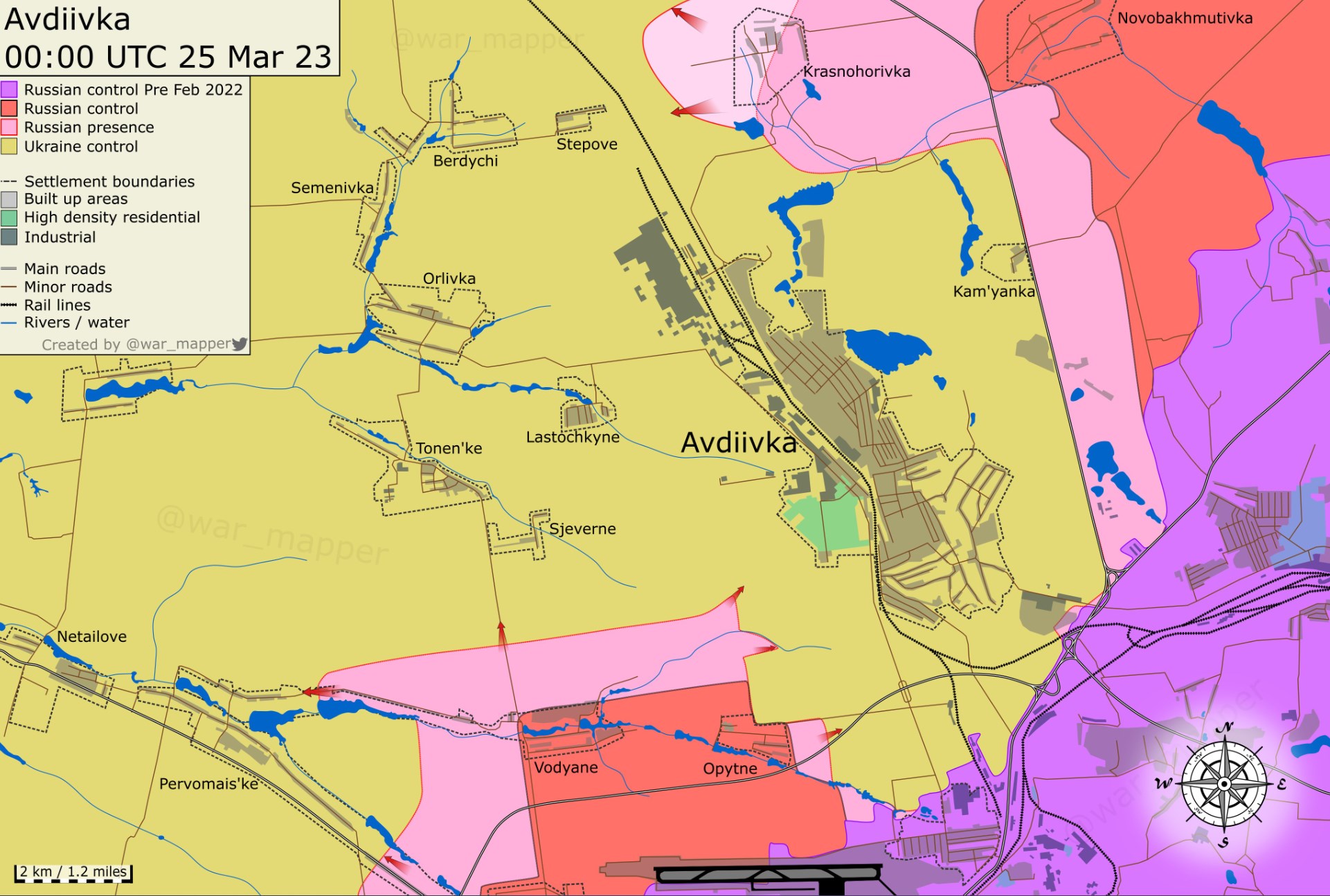 Британська розвідка вважає, що Росія та Україна зазнали тяжких втрат під Бахмутом. Тому "Росія, ймовірно, змістила центр докладання зусиль на Авдіївку, на південь від Бахмута, та на сектор Кремінна-Сватове на півночі".