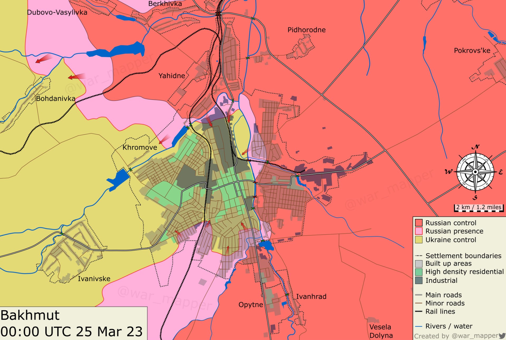 У "Вагнера" ж заявляють, що точаться бої за промзону заводу кольорових металів. Також вони повідомляють про спроби штурму Хромова, через яке постачається Бахмут із західного боку. Судячи з західних карт, росіяни справді поряд з Хромовим, але про їхнє просування там за останні дні не повідомлялося.
