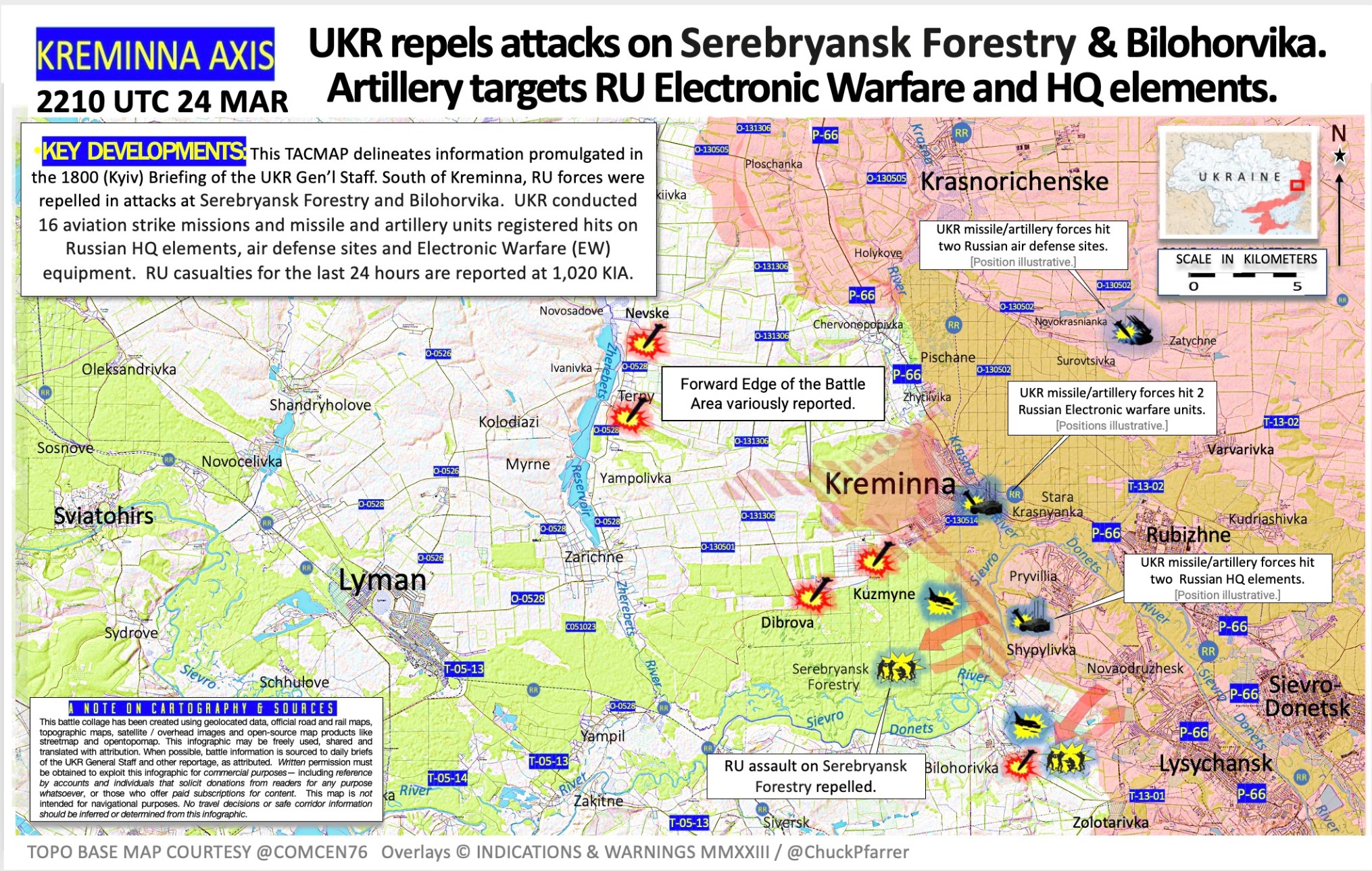 За даними українського Генштабу, на Куп'янському та Лиманському напрямках противник атакував у районі Серебрянського лісництва, а також населених пунктів Гряниківка, Сіньківка, Діброва, Білогорівка та Спірне.