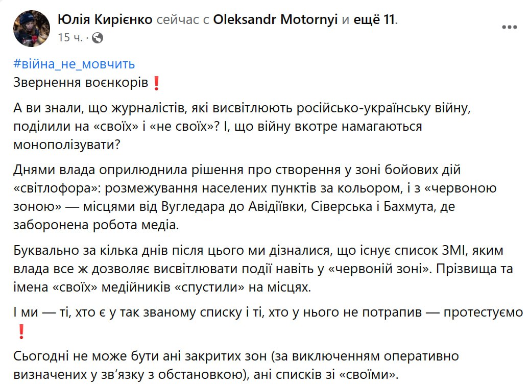"Днями влада оприлюднила рішення про створення в зоні бойових дій "світлофора": розмежування населених пунктів за кольором та з "червоною зоною" - місцями від Вугледару до Авдіївки, Сіверська та Бахмута, де заборонено роботу медіа.