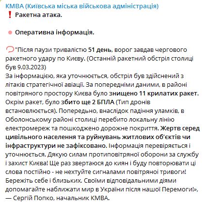 У Києві, за попередніми даними, в районі повітряного простору Києва було знищено 11 крилатих ракет. Крім ракет, було збито ще 2 БПЛА (тип дронів встановлюється).