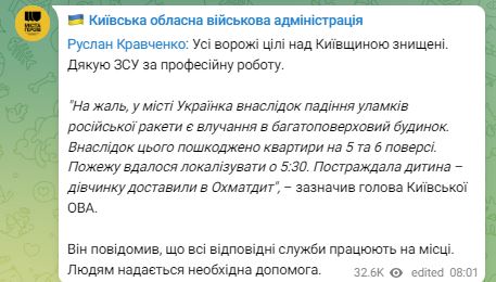 Губернатор Київської області Руслан Кравченко повідомив, що внаслідок падіння уламків російської ракети в Українці є потрапляння до багатоповерхового будинку.
