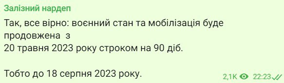 Військовий стан та мобілізація в Україні буде продовжено з 20 травня 2023 року терміном на 90 діб – тобто до 18 серпня 2023 року.