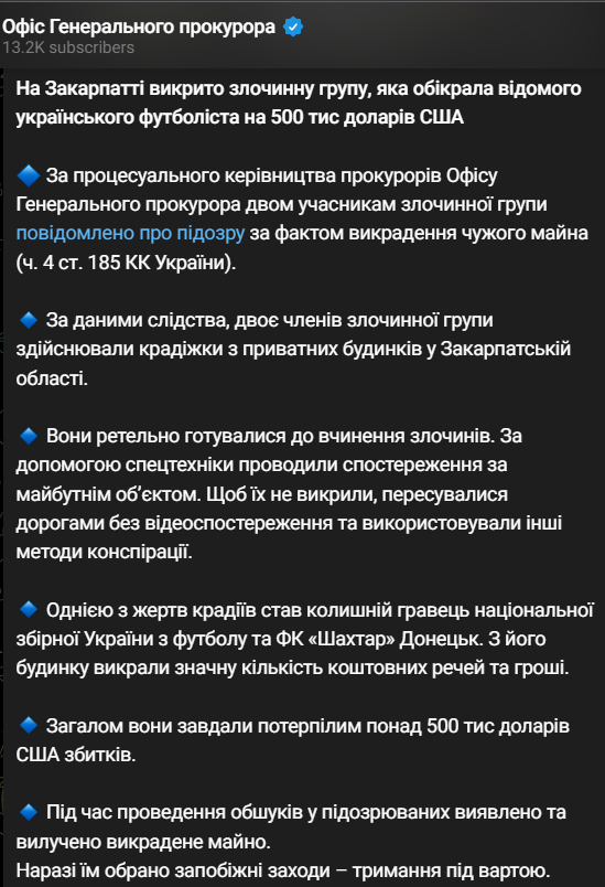 На Закарпатті викрито злочинну групу, яка обікрала відомого українського футболіста на 500 тисяч доларів.