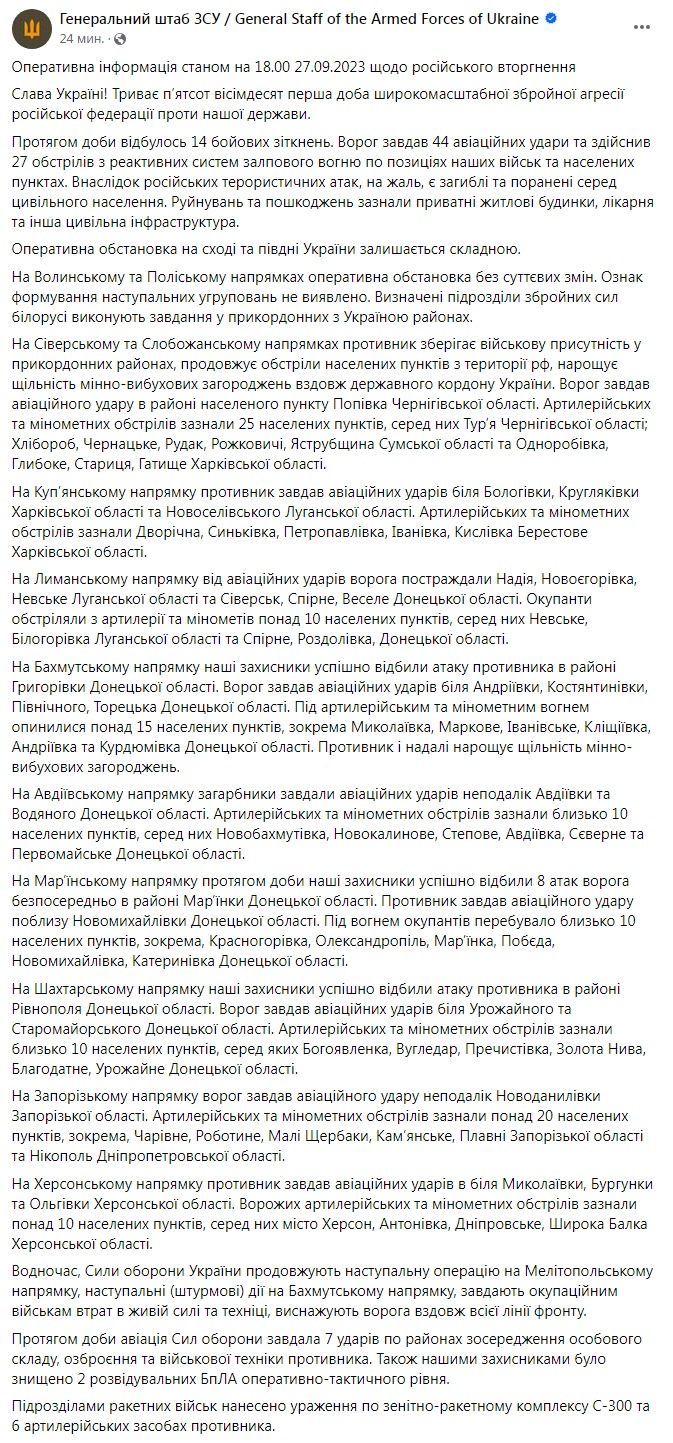 Генеральний штаб ЗСУ опублікував оперативну інформацію щодо ситуації на фронті станом на 18:00 27 вересня.