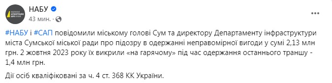 НАБУ та САП повідомили міського голови Сум Олександра Лисенка та директора Департаменту інфраструктури міста Сумської міської ради про підозру в отриманні неправомірної вигоди у сумі 2,13 млн грн. 2 жовтня їх зловили на гарячому під час отримання останнього траншу хабара – 1,4 млн грн.
