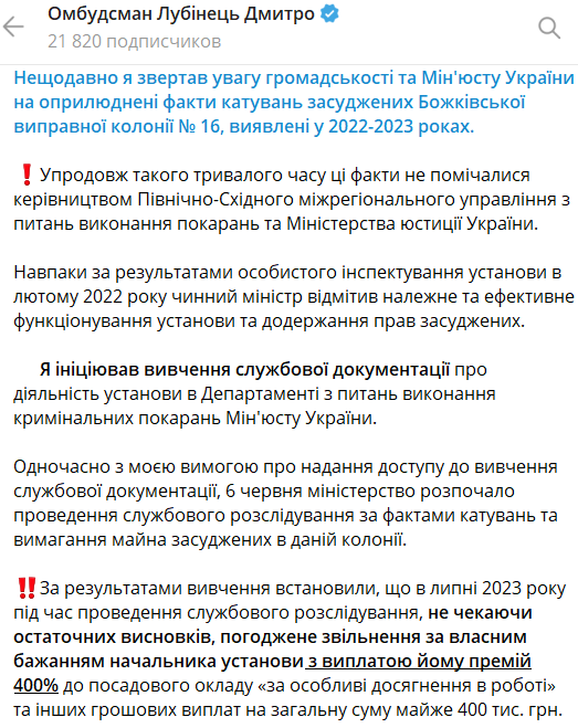 Лубинець закликав Державне бюро розслідувань перевірити, чому "керівництво кримінально-виконавчої служби ухвалило рішення про безпідставне та незаконне нарахування 400% преміювання керівника після встановлених систематичних порушень та фактів тортур та побиття засуджених".