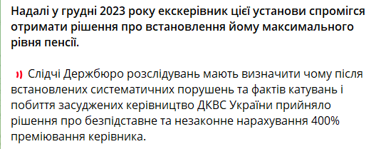 "У липні 2023 року під час проведення службового розслідування, не чекаючи остаточних висновків, погоджено звільнення за власним бажанням начальника установи з виплатою йому премій 400% до посадового окладу "за особливі досягнення у роботі" та інші грошові виплати на загальну суму близько 400 тис. грн. Надалі у грудні 2023 року екс-керівник цієї установи зміг домогтися рішення щодо встановлення йому максимального рівня пенсії", - сказано у публікації.