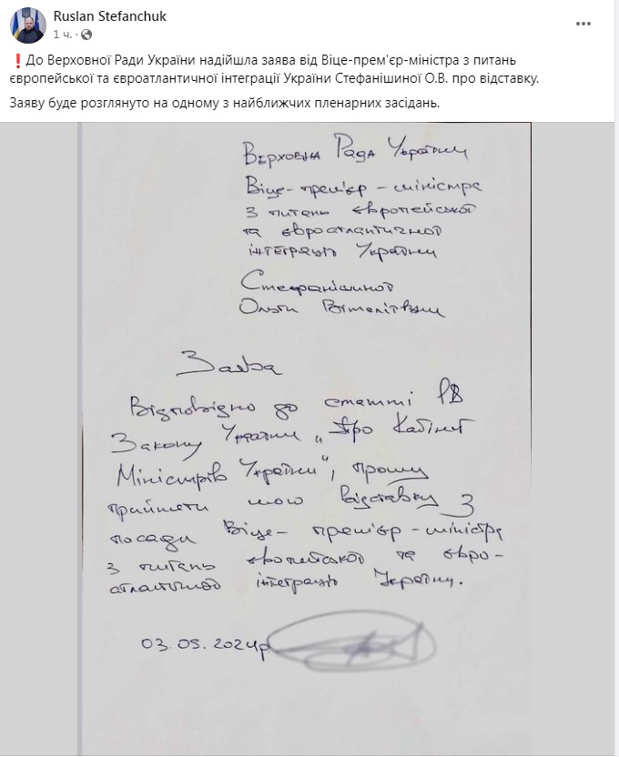 Також Стефанчук повідомив, що до Ради надійшла заява про відставку і від віце-прем'єр-міністра – міністра з питань реінтеграції тимчасово окупованих територій Ірини Верещук.