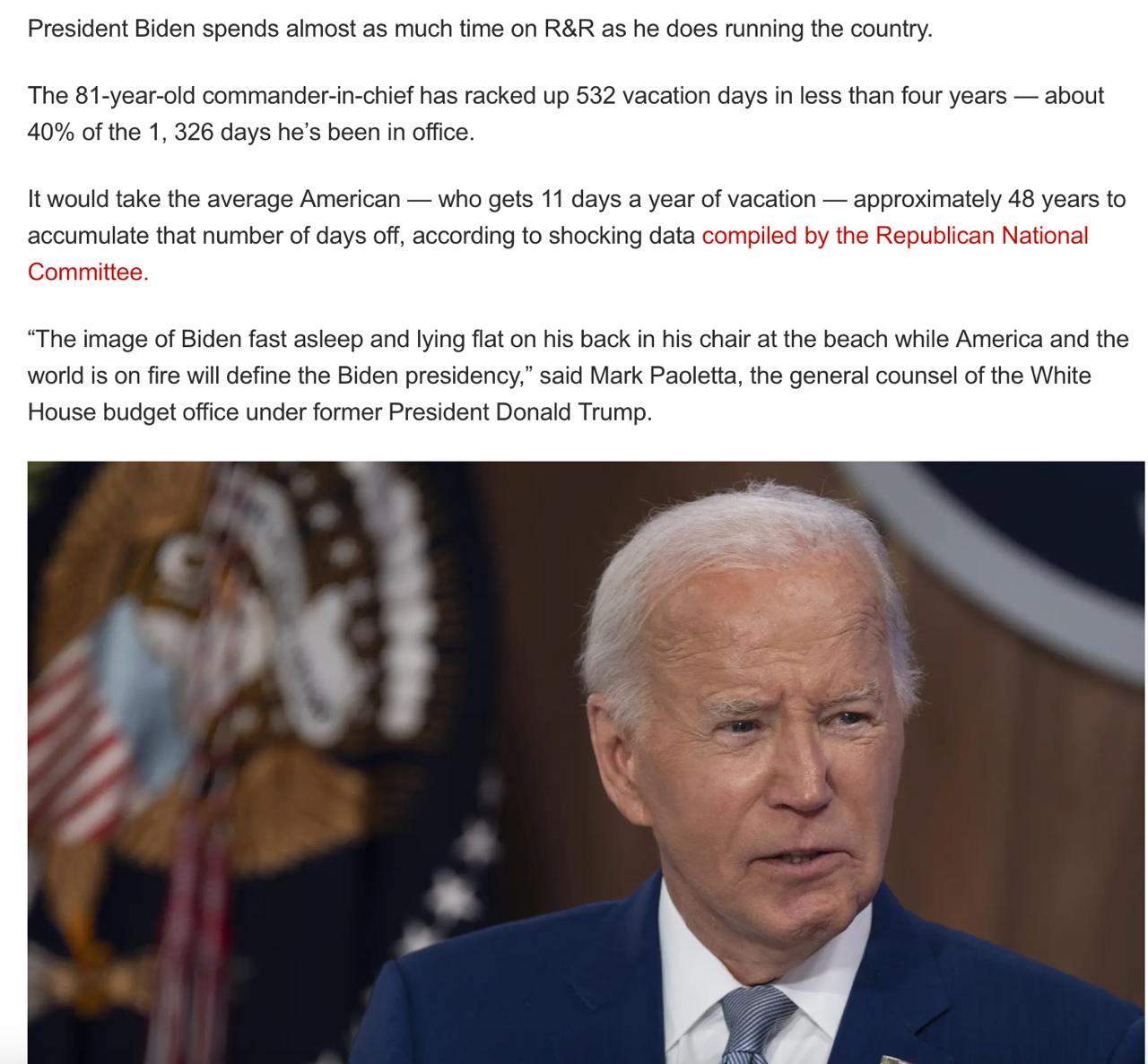 За даними республіканців, президент з моменту вступу на посаду 532 дні пробув у відпустці - це 40,3% із 1326 днів, які він провів на своїй посаді.