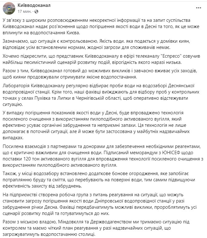 "Хочемо наголосити, що представник Київводоканалу в ефірі телеканалу "Еспресо" озвучив найбільш песимістичний сценарій розвитку подій, ймовірність якого нині низька", – йдеться у публікації компанії у Фейсбуці.