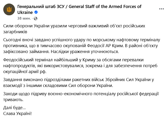 Приліт у Феодосії. Генштаб ЗСУ заявив про удар по найбільшому морському нафтовому терміналу Криму