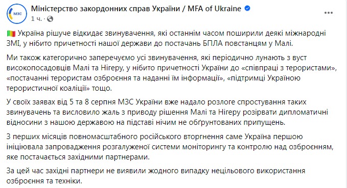 МЗС у спеціальній заяві "рішуче відкинув" такі заяви, а також "усі звинувачення, що періодично звучать з вуст чиновників Малі та Нігеру, у нібито причетності України до співпраці з терористами, постачанні терористам озброєння та надання їм інформації, підтримці Україною терористичної коаліції. ".