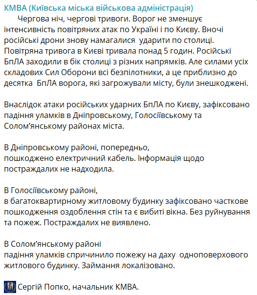 Також уночі російські дрони атакували Київ. Повітряна тривога у столиці тривала понад 5 годин, БПЛА заходили за різними напрямками.