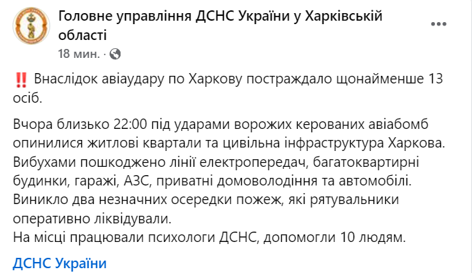 Вчора пізно ввечері росіяни вдарили КАБами по житлових кварталах та цивільній інфраструктурі Харкова. Постраждали щонайменше 13 людей, серед них дитина.