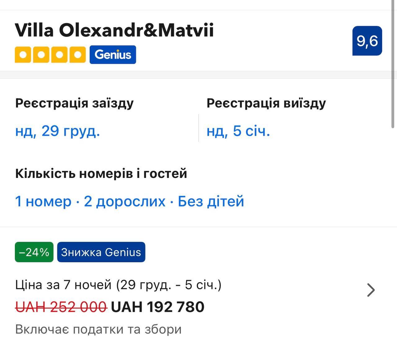 Шале Villa Olexandr&Matvii коштує 252 000 гривень без знижки та 192 780 гривень зі знижкою.