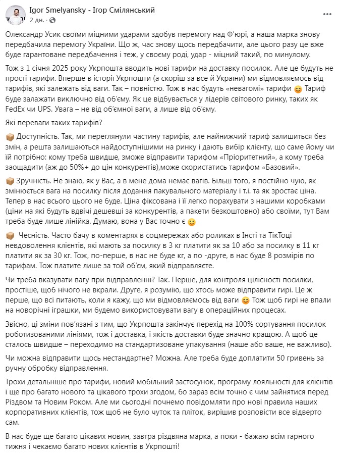 З 1 січня 2025 року "Укрпошта" запроваджує нові тарифи на доставку посилок. Вони залежатимуть не від ваги, а від обсягу відправлення, як оператори світового поштового ринку FedEx або UPS.