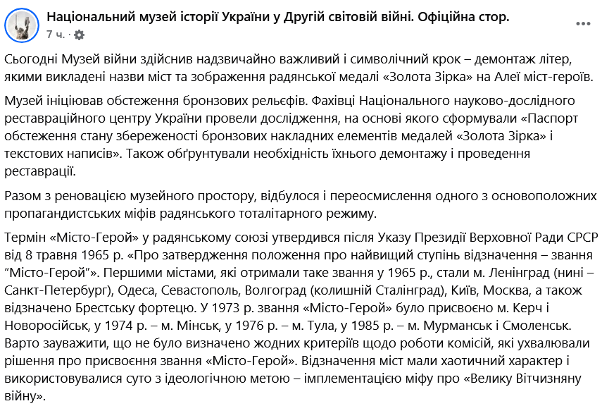 У повідомленні йдеться, що співробітники музею розпочали обстеження бронзових рельєфів на алеї міст-героїв. На основі дослідження фахівці Національного науково-дослідного реставраційного центру України сформували "Паспорт обстеження стану збереження бронзових накладних елементів медалей "Золота Зірка" та текстових написів" та аргументували необхідність демонтажу та реставрації.