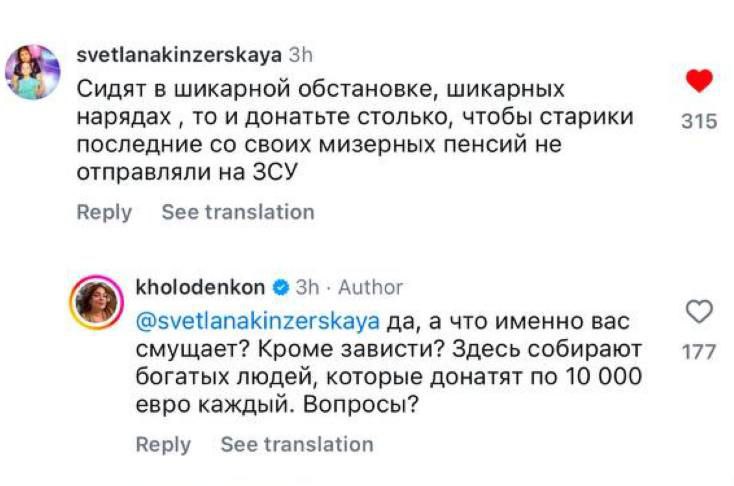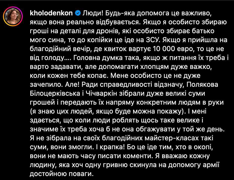Після цього Холоденко видалила відео з Полякової та написала новий пост, де заявила, що неважливо, як збирати гроші, головне, що ці кошти "йдуть в окопи". І закликала "не обгажувати тих людей, які роблять таке велике і значуще".