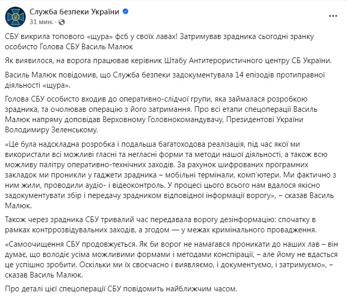 Голова штабу антитерористичного центру СБУ, який із 2016 року очолював антитерористичне управління Служби безпеки, виявився агентом ФСБ. Його затримав сьогодні вранці особисто голова СБУ Василь Малюк.