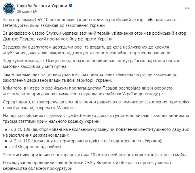 В Україні заочно отримав вирок відомий російський актор Дмитро Пєвцов, який грав у серіалі "Бандитський Петербург", який зараз є депутатом Державної думи. Йому дали 10 років із конфіскацією майна.