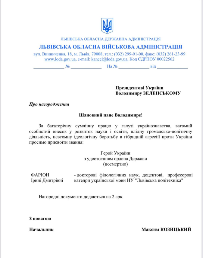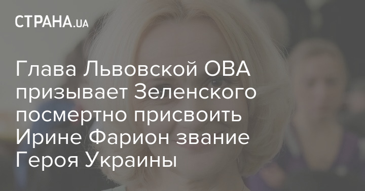Голова Львівської ОВА Максим Козицький закликає президента Володимира Зеленського посмертно надати Ірині Фаріон звання Героя України.