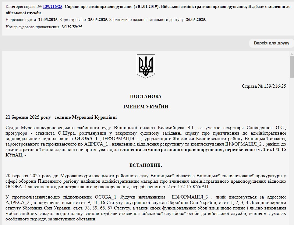 Мурованокуриловецький районний суд Вінницької області виправдав начальника відділення рекрутингу та комплектування місцевого ТЦК та СП, підполковника Ігоря Б., який не виконав план мобілізації.