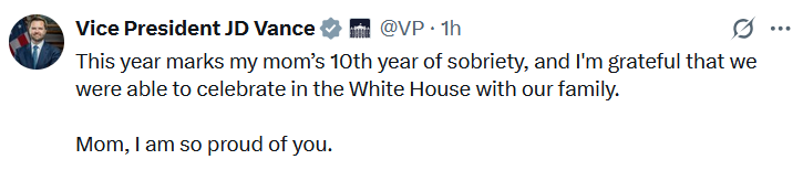 "Цього року виповнюється 10 років тверезості моєї мами, і я вдячний, що ми змогли відсвяткувати це в Білому домі з нашою родиною. Мамо, я так пишаюся тобою", - написав Венс.