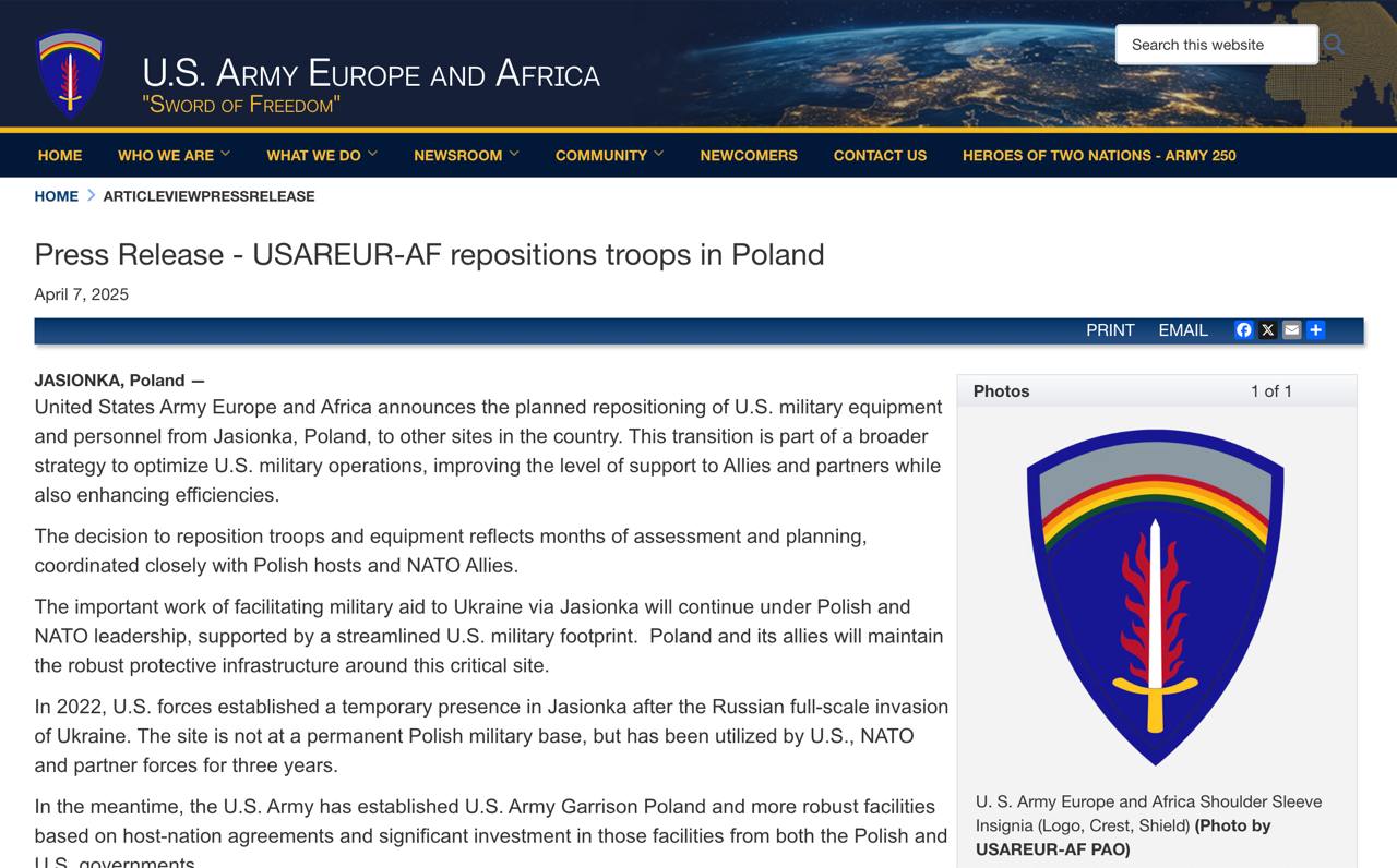 Командування зазначає, що персонал та техніка США переїдуть у "інші місця" Польщі.