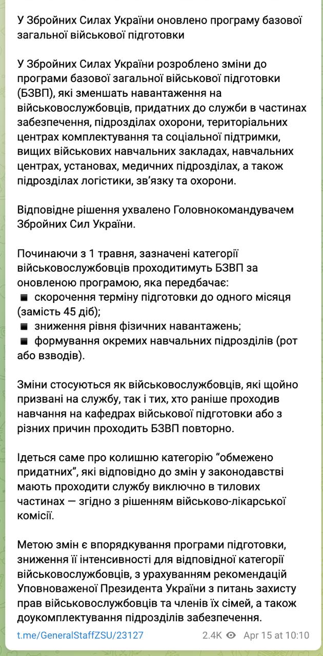 Починаючи з 1 травня зазначеним категоріям військовослужбовців не лише скоротять термін підготовки, а й зменшать рівень фізичних навантажень. Також буде сформовано окремі навчальні підрозділи (роти або взводи).