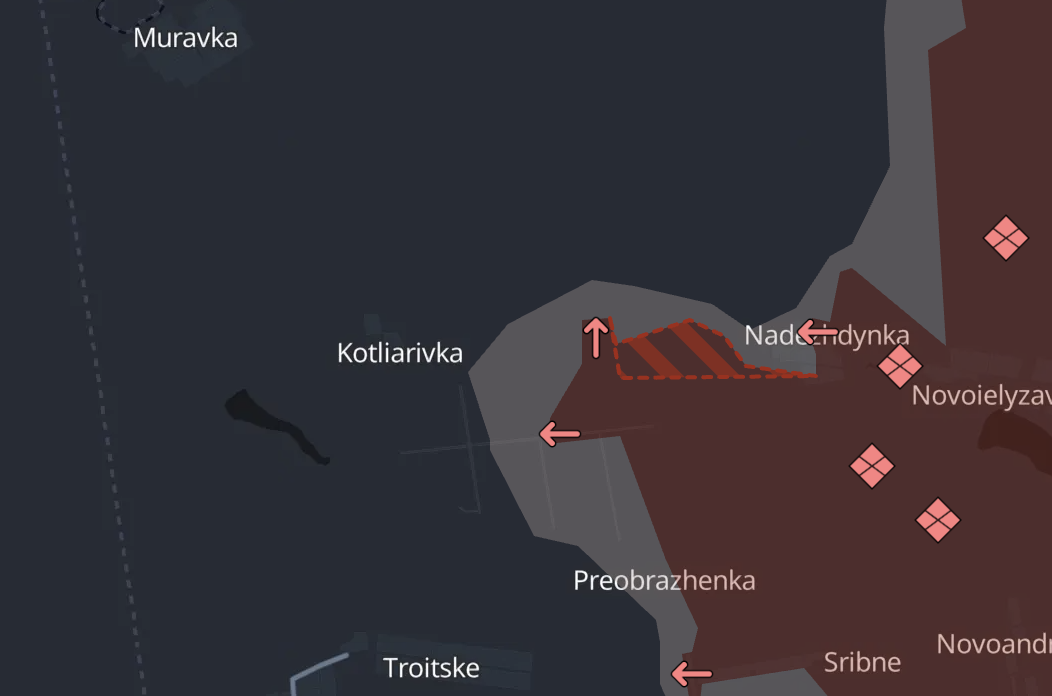 Російська армія просунулась на Покровському напрямку біля Надеждівки - на західному краї виступу на південь від Покровська, біля кордонів Дніпропетровської області.