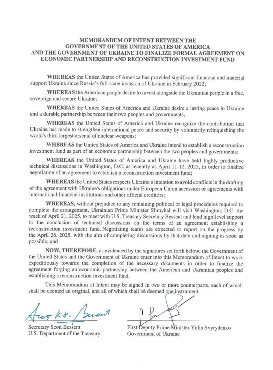 21 квітня до США приїде до обговорення остаточних деталей прем'єр Шмигаль. Він зустрінеться з міністром фінансів США Бессентом.