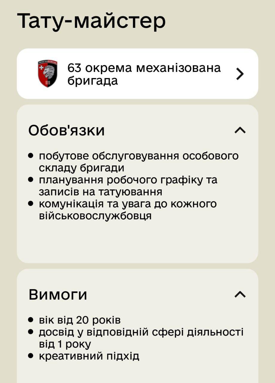 63-а окрема механізована бригада ЗСУ розмістила оголошення про пошук тату-майстра.
