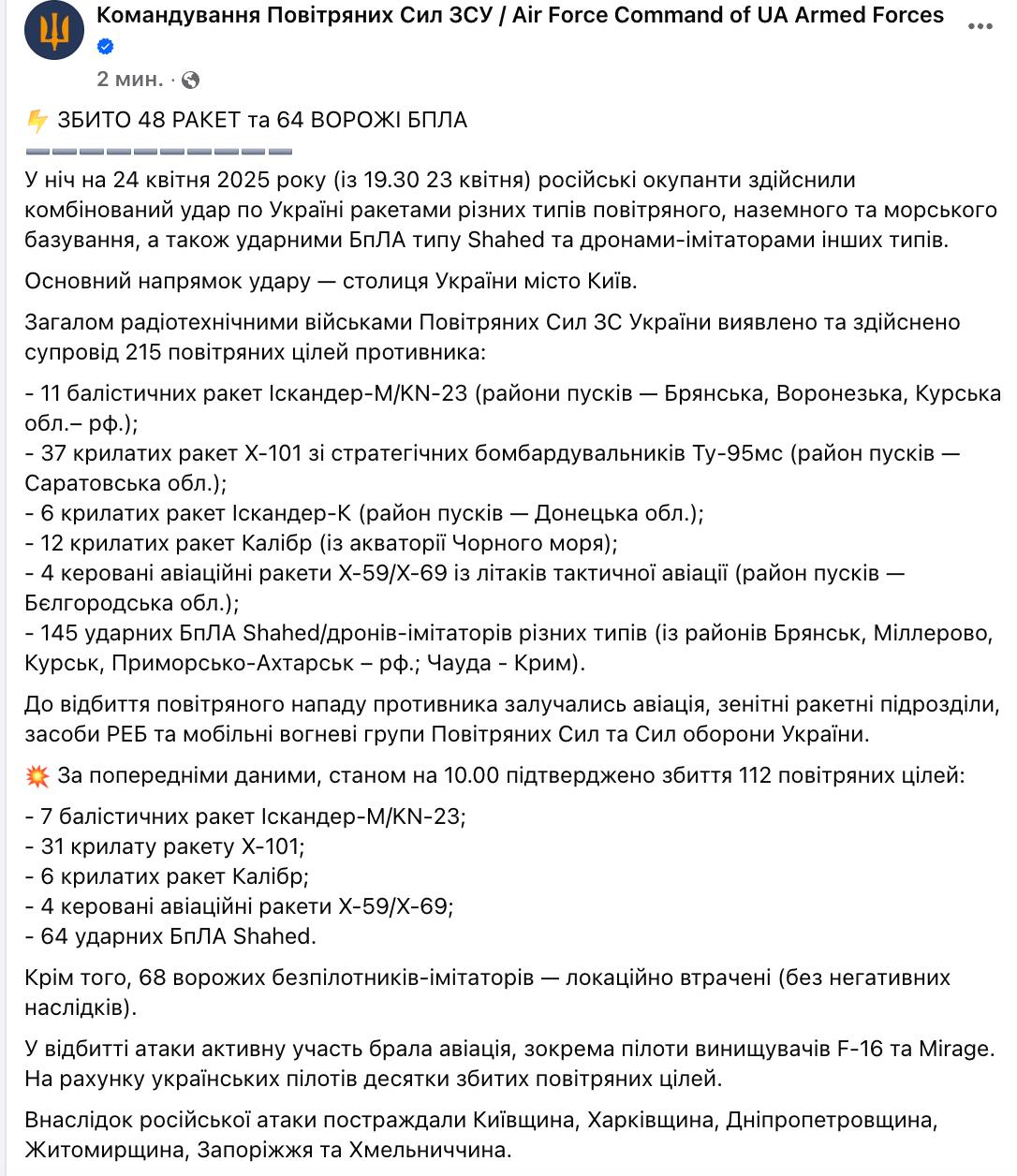 Вночі Україну атакували 70 ракет та 145 "Шахедів". Збити, за офіційними даними Повітряних сил ЗСУ, вдалося 48 ракет та 64 БПЛА. Ще 68 локаційно втрачено без негативних наслідків.