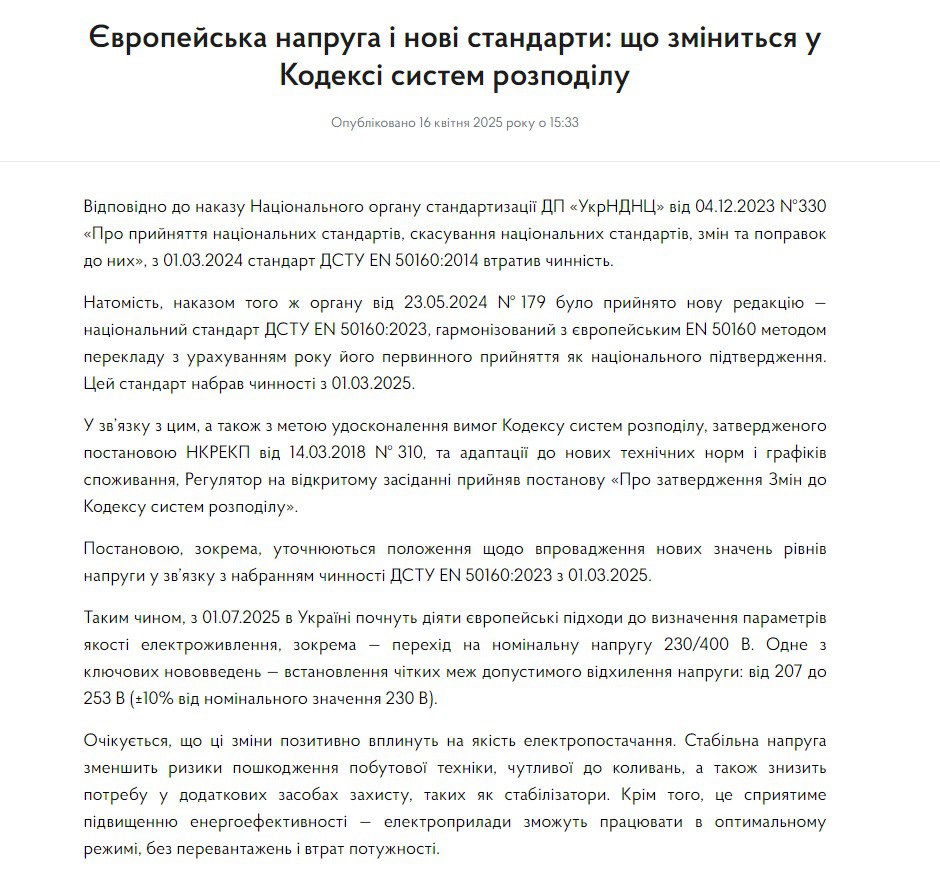 "В Україні почнуть діяти європейські підходи до визначення параметрів якості електроживлення, зокрема, перехід на номінальну напругу 230/400 В. Одне з ключових нововведень - встановлення чітких меж допустимого відхилення напруги: від 207 до 253 В (±10% від номінального значення 230 В)", - йдеться у повідомленні.