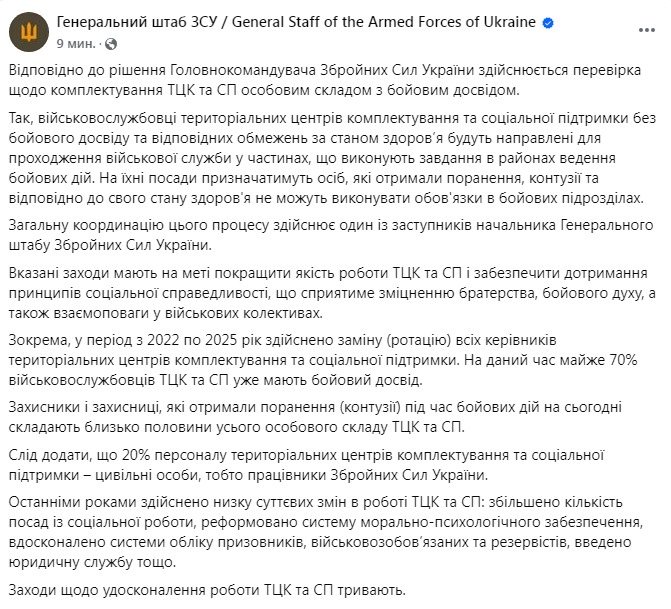 У ній також сказано, що з 2022 до 2025 року замінили всіх керівників територіальних центрів комплектування. А зараз майже 70% військовослужбовців ТЦК та СП уже мають бойовий досвід. Поранення і контузії під час бойових дій становлять близько половини всього особового складу ТЦК. При цьому 20% персоналу територіальних центрів комплектування – це цивільні особи.