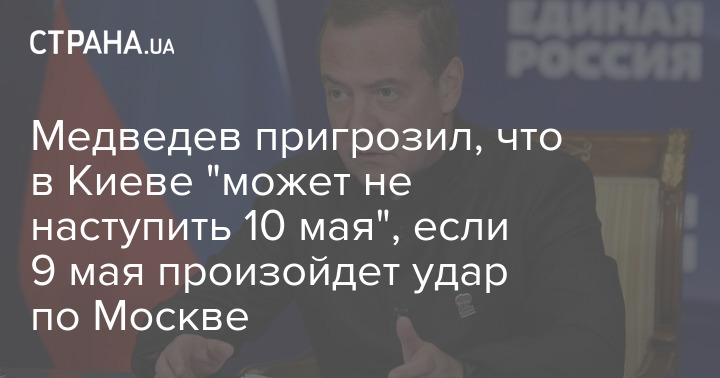 Заступник голови Ради безпеки РФ Дмитро Медведєв пригрозив, що у Києві "може не наступити 10 травня", якщо 9 травня відбудеться удар по Москві.
