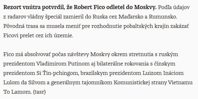 Як написав портал новин Dennik N, його літак летів до Москви за довгим південним маршрутом, що проходить через Угорщину, Румунію, Чорне море і Грузію. Маршрут змінили після того, як у середу літаку голові словацького уряду заборонили пролітати над своєю територією Естонія, Латвія та Литва.