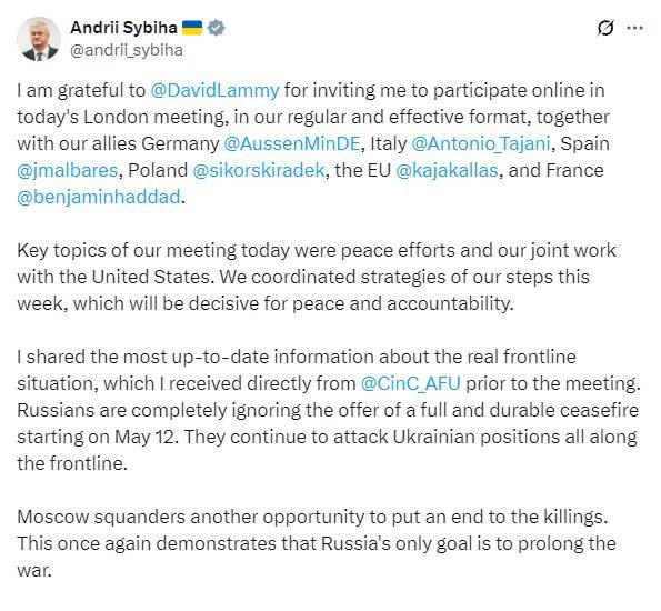 "Вони продовжують атакувати українські позиції по всій лінії фронту. Москва втрачає ще одну можливість покласти край вбивствам. Це ще раз демонструє, що єдина мета Росії - продовжити війну", - написав міністр.