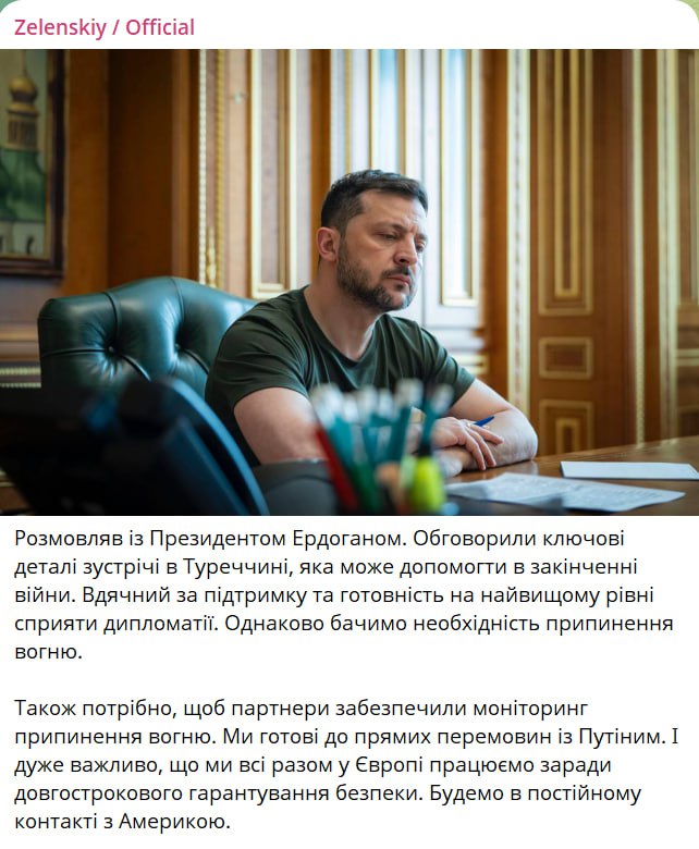 "Обговорили ключові деталі зустрічі в Туреччині, яка може допомогти в закінченні війни... Однаково бачимо необхідність припинення вогню. Також необхідно, щоб партнери забезпечили моніторинг припинення вогню. Ми готові до прямих переговорів з Путіним. І дуже важливо, що ми всі разом у Європі працюємо заради довгострокового забезпечення безпеки. Будемо в постійному контакті з Амері.