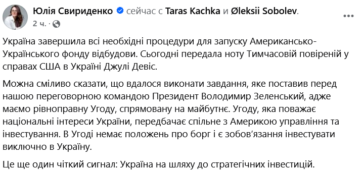 Про це повідомила віце-прем'єр-міністр України Юлія Свириденко на своїй сторінці у Фейсбуці.