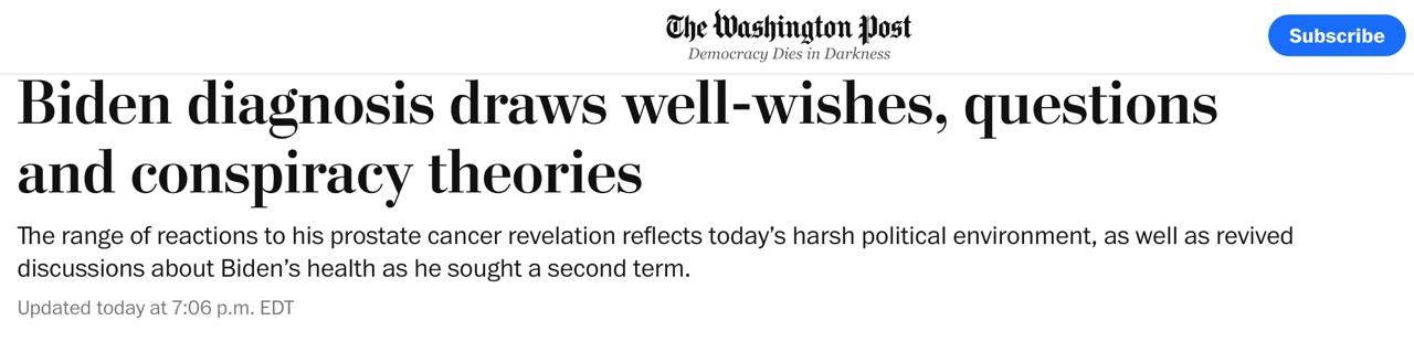 Взагалі практично з початку президентства ЗМІ писали про вкрай поганий фізичний стан демократа та ознаки у нього старечого недоумства. При цьому в результатах щорічних медичних оглядів Байдена, опублікованих у період його президентства з 2021 по 2025 рік, нічого не згадується про скринінг на простат-специфічний антиген (ПСА), який використовують для виявлення ранніх ознак раку передміхурової залози і рекомендує Американське онкологічне