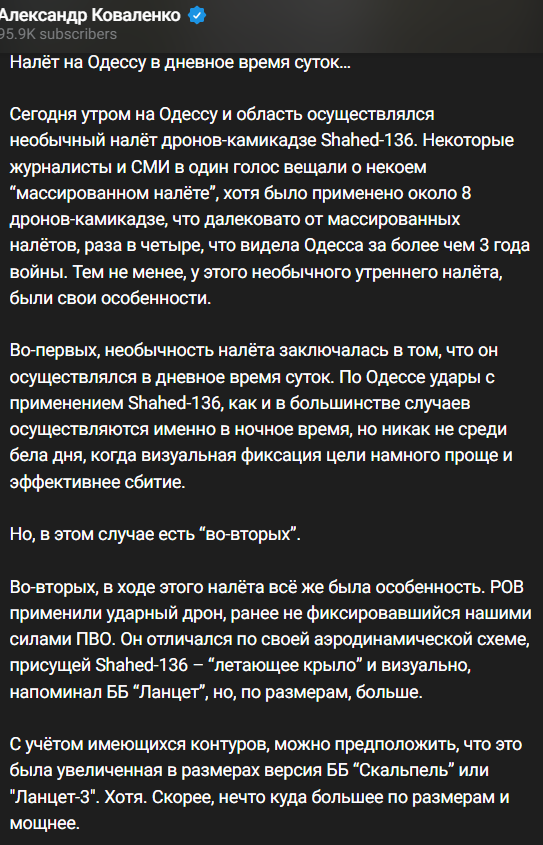 "Його точну назву ми поки що не знаємо, але до Одеси і вглиб області він долітає. При цьому мав можливість входу в наш повітряний простір на висоті 200 метрів. Видно, Одеса та область продовжують залишатися для РФ полігоном у питаннях випробувань як нових засобів ураження, так і тактики їх застосування", - пише Коваленко.