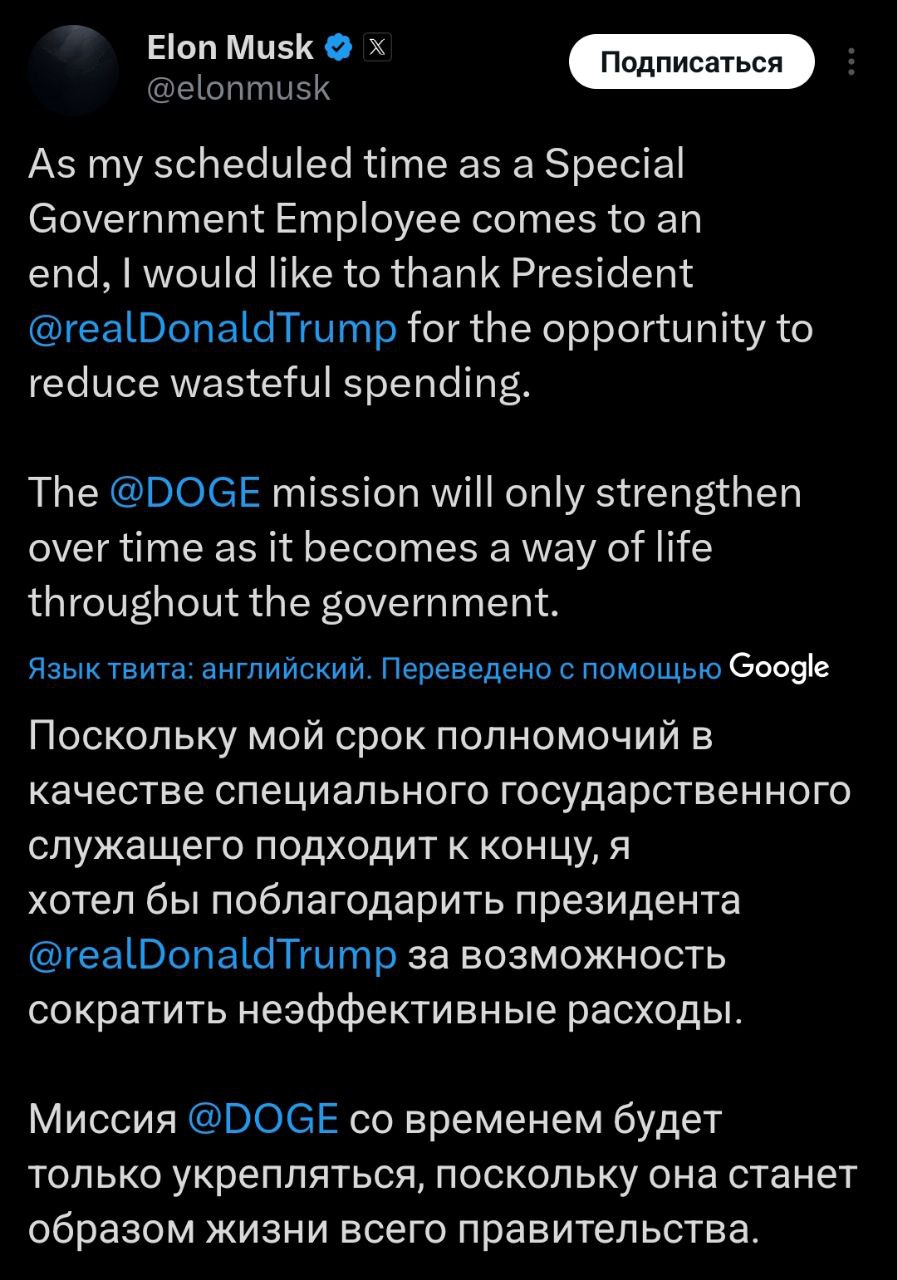 "Оскільки мій термін повноважень як спеціального державного службовця добігає кінця, я хотів би подякувати президенту США Дональду Трампу за надану мені можливість скоротити марнотратні витрати. Місія DOGE з часом тільки зміцнюватиметься, оскільки вона стане способом життя в усіх органах державної влади", - написав Маск.