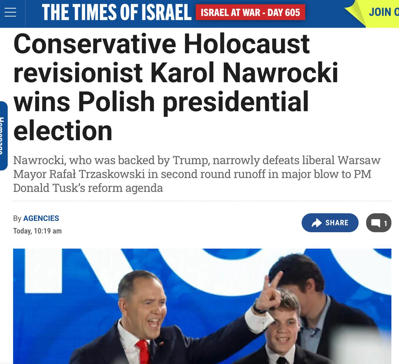 Навроцький очолює Інститут національної пам'яті, який набув репутації просування націоналістичних наративів про Голокост за уряду "Право і справедливість". Він зосередив цю версію історії у своїй кампанії", - пише The Times of Israel.