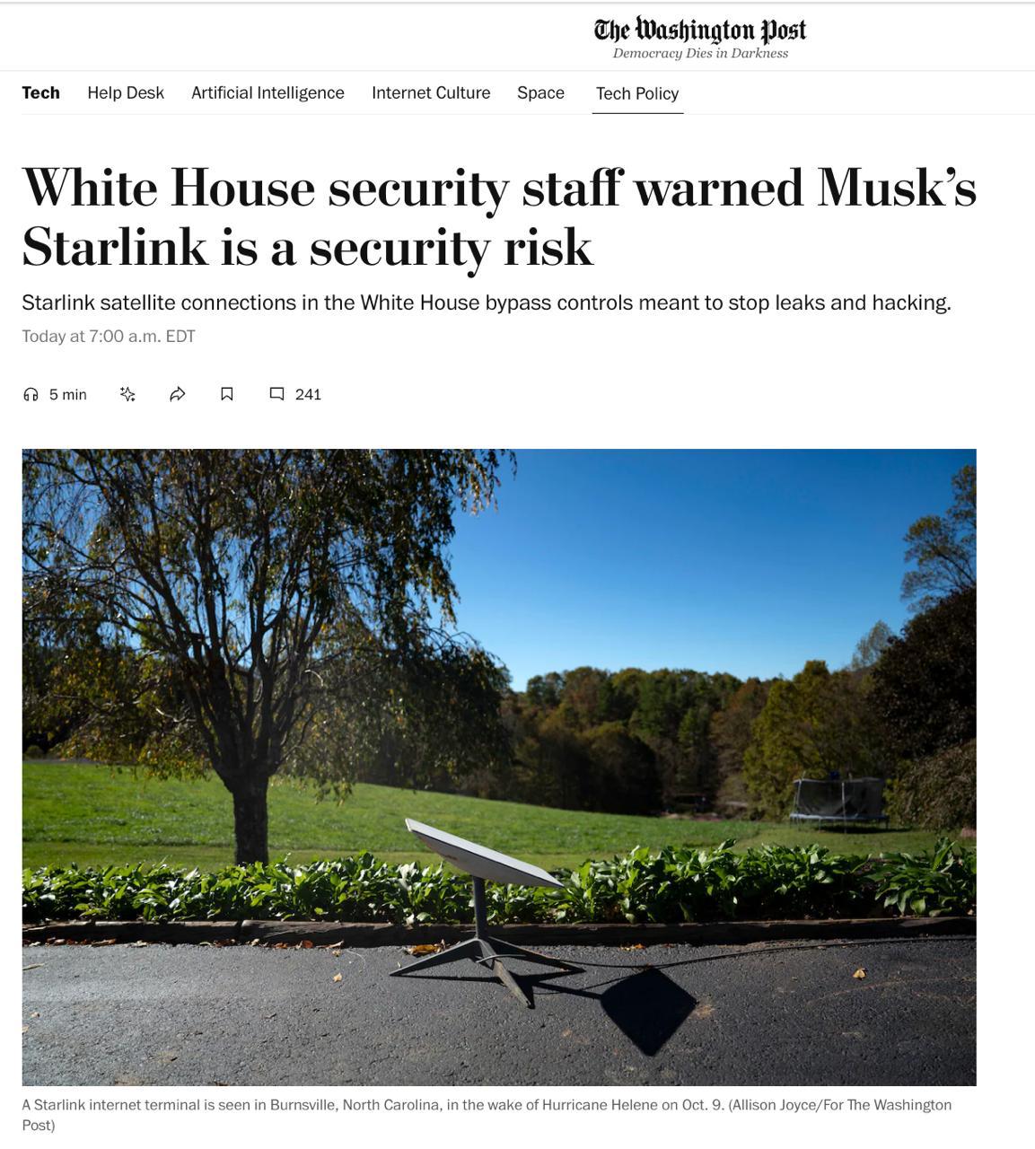 За даними видання, у лютому представники групи DOGE без попереднього повідомлення встановили термінал Starlink на даху сусідньої будівлі Ейзенхауера, де розташовані офіси адміністрації.