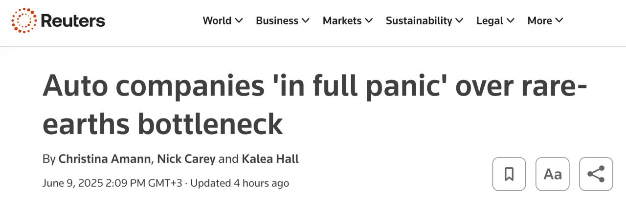 У автомобільної галузі виявилося мало альтернативних джерел постачання через домінування Китаю на ринку. Пекін контролює до 70% світового видобутку рідкісноземельних елементів, 85% переробних потужностей та близько 90% виробництва сплавів рідкісноземельних металів і магнітів, пише агентство.