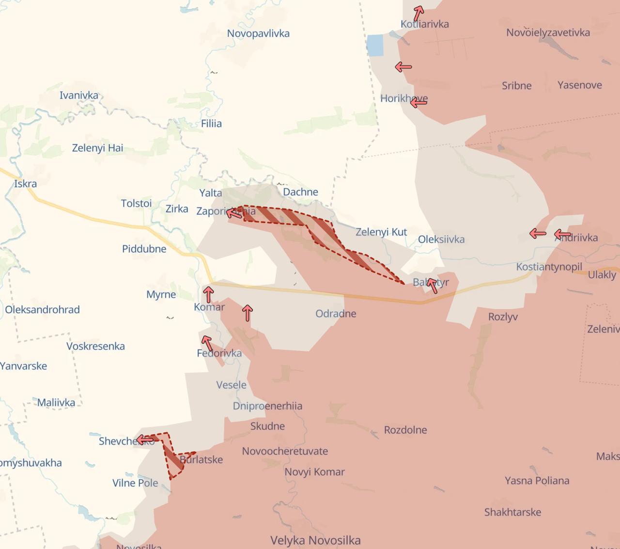 Україна цього не підтверджувала. Український військовий паблік DeepState сьогодні писав про просування у цьому районі росіян. На його карті село Запоріжжя частково перебуває під контролем РФ, частково у сірій зоні.