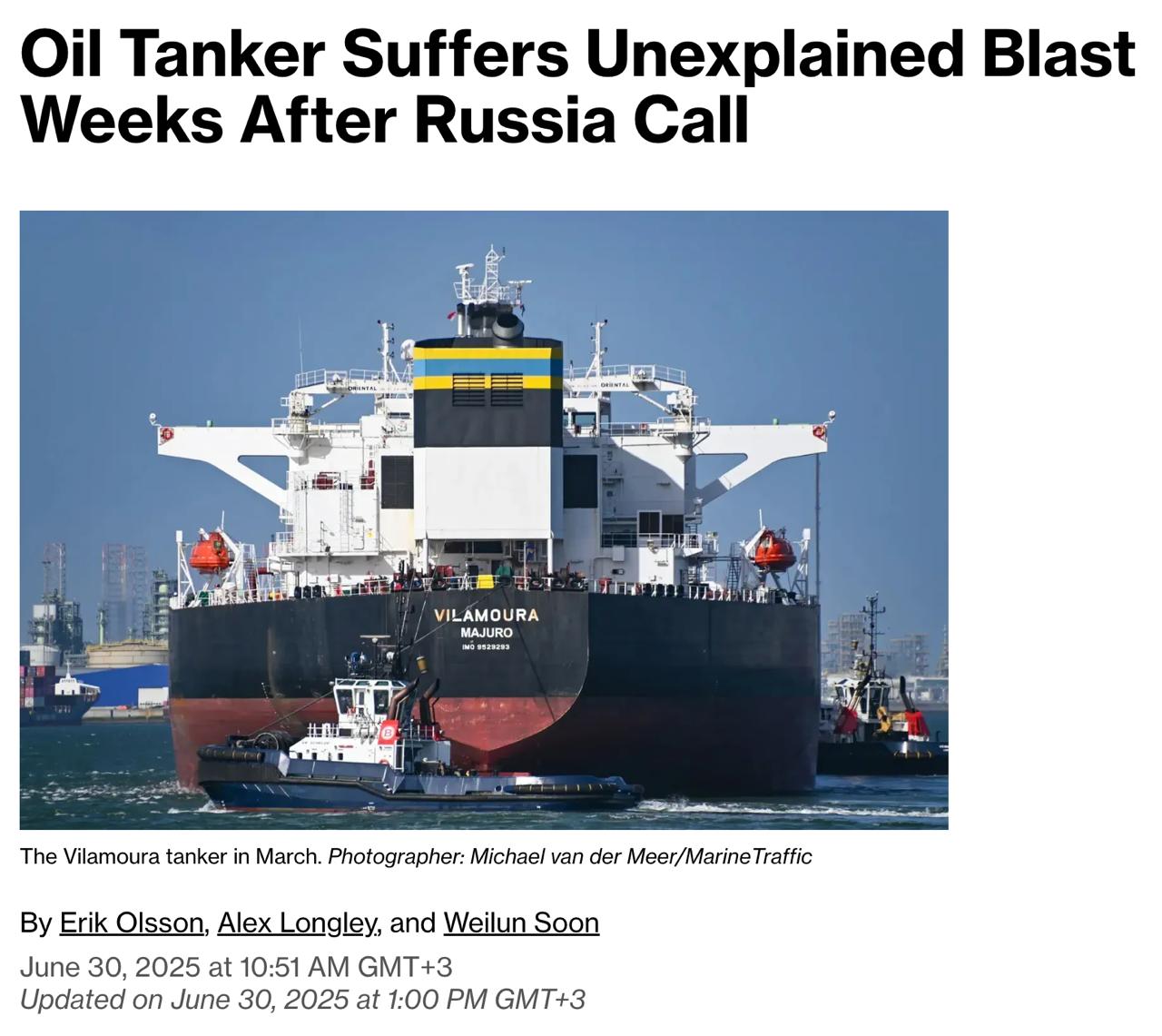 Bloomberg зазначає, що за останні місяці сталася вже серія загадкових вибухів на нафтових танкерах, які раніше заходили до російських портів. Через це судновласники почали перевіряти корпуси своїх суден на наявність мін за допомогою водолазів та підводних апаратів.