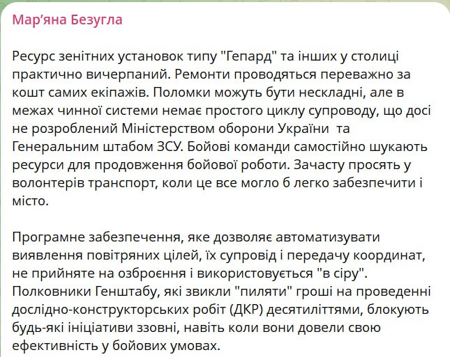 Ресурс зенітних установок типу німецької "Гепард" та інших у Києві практично вичерпано. Ремонти здійснюються переважно за рахунок самих екіпажів.